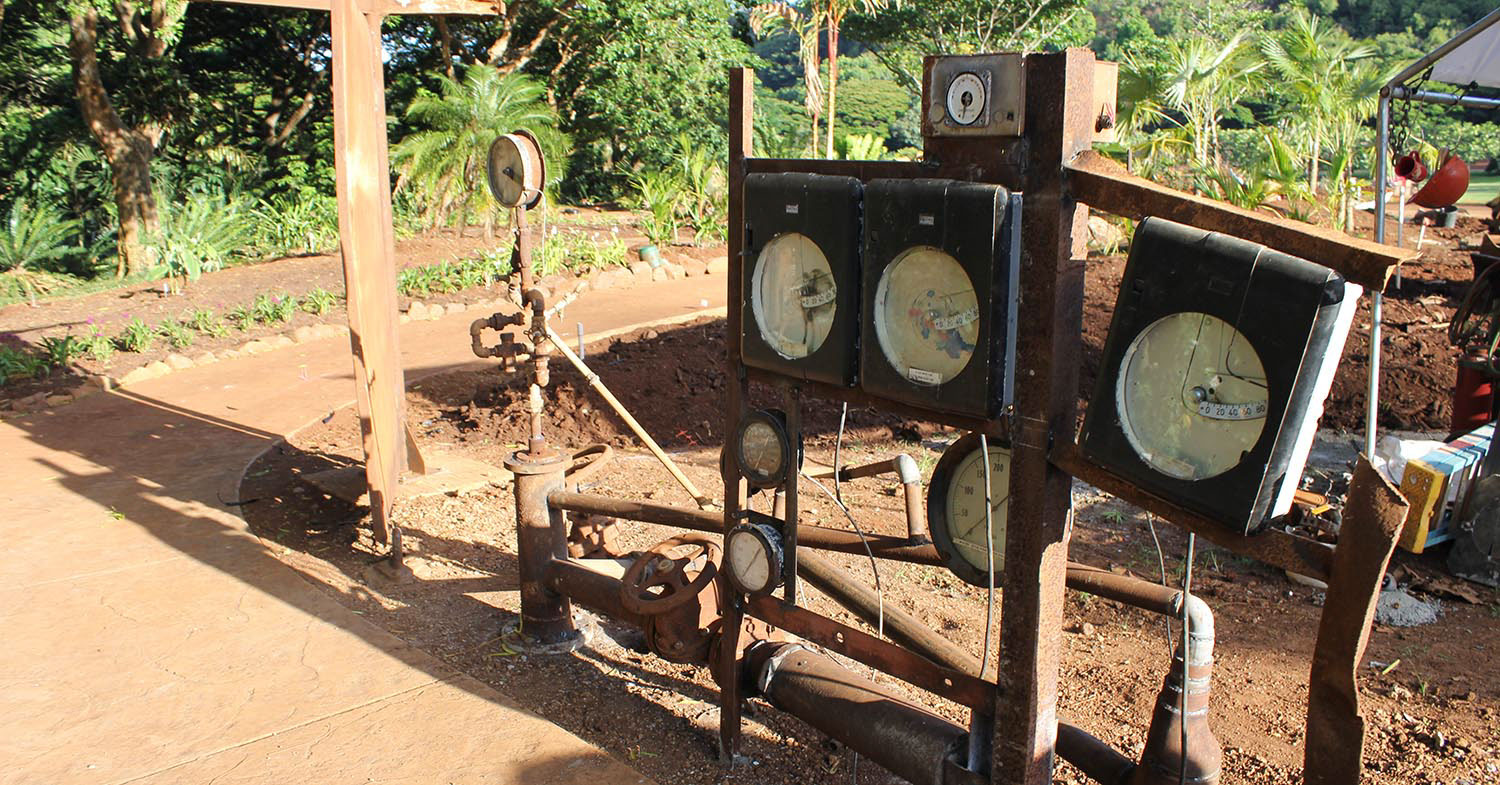 • Travelling from food for thought and through the redemption area, visitors will have been endeared to the work of NTBG – passed the stunningly beautiful hibiscus stories – from native to hybridized hibiscus, passed the inspirational breadfruit global hunger, and the motivational stories of real people taking a stand to make a difference in the world – often at personal risk – but always to the total benefit of the world. These incredible stories will set the scene to tell the tales of our inspiring plant hunters, the inspiring accounts of our ex-situ conservation work in places like the Limahuli upper preserve (they may be romanticized a little – forgive us) but are designed to create empathy and engagement. Visitors turn a corner to discover that much of this work genetic safety net takes place at NTBG HQ, in our nurseries, they see benches of plants – the bregamia – and learn about this inspiring work. At the end of the long nursery bench is a large boulder (5-6 foot high) with a single plant on top – held up like an Olympic torch - blazing a trail for elite plant conservationists of our past, present and future. Visitors walk past this to discover what looks like a post industrial area – jarring, awkward and perhaps uncomfortable – they encounter ooze representing the loss of faith, they see rusting and twisting metal. They see a series of dials, temperature and pressure gauges that are attached to what looks like a mini substation – this represents in an obvious way how the planet is under pressure – and they have to walk through an awkward looking (potentially noisy) doorway which frames a stylized sculptural element that looks like it belongs outside a large corporate entity, or some Stalinesque / eastern European modernist place – but this frames a beautiful landscape - worthy of a tropical retreat – visitors exit the crisis area to discover beauty, flowers, and hope… a beautiful journey to a refreshingly damp, shady, fern and moss clad gorge.