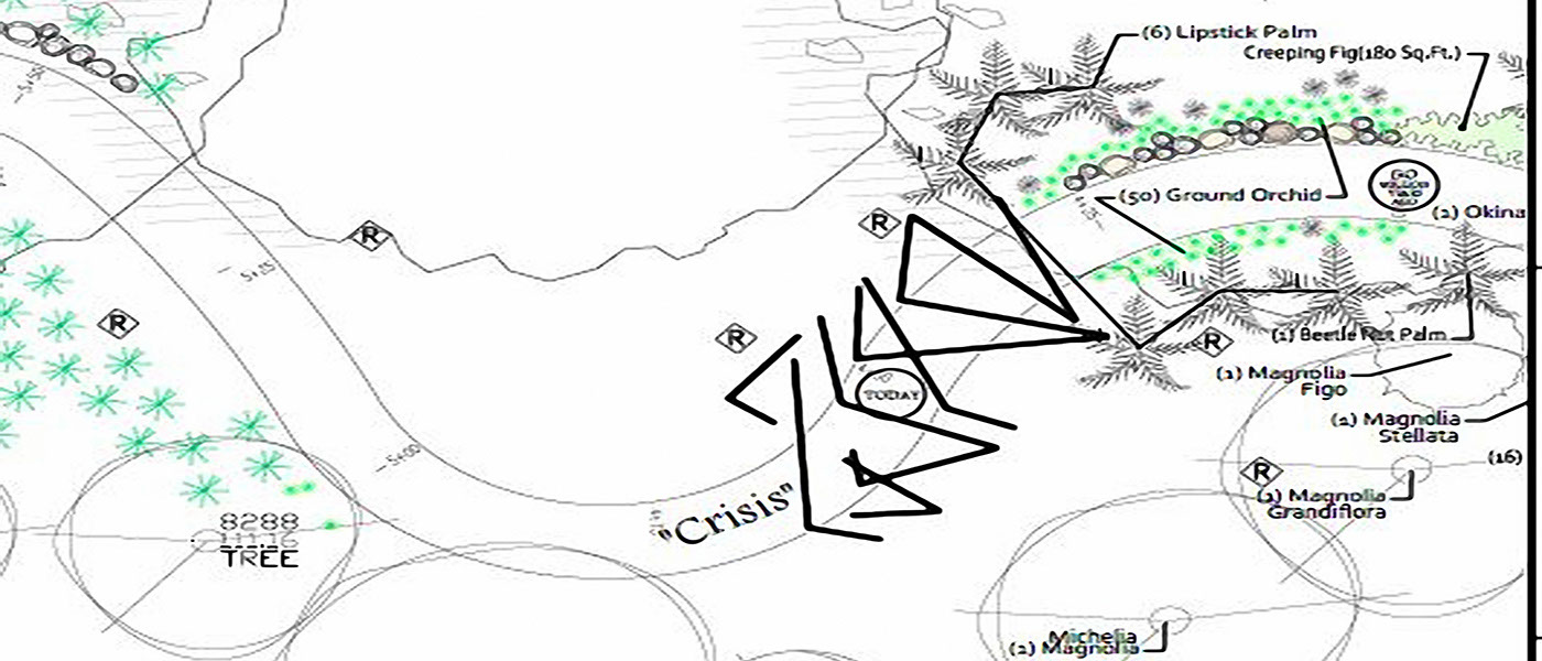 • Travelling uphill from the evolution of biodiversity: visitors will finish the evolution of bd by a beautiful encounter of flower diversity it will be like walking through an imagined tropical garden (the type of thing hotel’s strive to achieve). They will see some metal in the background of this display but it won’t be clear what it is. They will see a semi sculptural element that could be reminiscent of something that might be found outside the headquarters of a large corporate organization or even an eastern European modernist era. Turning a corner they will think tey see a structure of an old steel building (this is in fact only an entrance way) but this building on one side will be complete, on the other will be disintegrating. To continue visitors have to walk through a rusty doorway (10 feet high and 10 feet wide) the rusty door can move very slightly to make a metallic creepy noise ) the building is being reclaimed by nature so vines are taking over. As visitors proceed they pressure gauges, dials and clocks that look like they are attached to a mini energy station – each gauge showing that a system is becoming overloaded, is under pressure and about to reach critical mass / boiling / crisis point. This metaphorical tipping point is what we want our visitors to understand before they finish their visit because it is what motivates, inspires and informs much of our conservation and science. Each dial will have a heading that reflects a planetary problem – global warming, pesticide or chemical use / petrochemical dependency / invasive plants in vulnerable habitats / etc. all under pressure etc. Although visitors will be outside the surroundings of this area will make visitors feel they are actually inside some kind of building that is disintegrating around them. To the left open air – to the right pipes, large circular handles (valves) on large steel pipes that seem to be connected to some kind of elaborate machine that controls something that is bigger than the sum of its individual parts (a bit like the way the planet is really). The next thing visitors notice is a steam punk style boiler plate clad tank object that is oozing this incredible stream of gunk (this will actually be made of concrete) but will look almost like lava with bubbles of gas (glass ball-balls) emerging from something below. This stream of gunk will flow to the path, go under it, and re-emerge the other side. It will be dramatic and poignant (intentionally provocative). Some visitors may notice a small square hole in the tank – and those really observant may peep into this to see that the tank looks like it contains a beautiful garden scene – a garden of Eden - leaking into oozy gunk. Surrounded by a small thicket of dorment trees (these are actually made of aluminium piping. Each tree of either white, silver and black bark, will be both intriguing and slightly disconcerting. The space is meant to feel slightly uncomfortable, to ensure Visitors notice it, but want to move on. They see a large, stable, natural rock, although blocking the view of the next area, placed on the top of this 5/6 foot rock is a single Bergamia. It is held up, physically and metaphorically, like an Olympic torch - representing how NTBG has been working for 50 years to save plants. This one plant story is very iconic, and therefore carries the story of conservation and hope. Visitors walk past this dramatic piece to discover a nursery potting bench with 50-100 bregamia plants in pots. This mass planting is the first of a few in-situ conservation stories we want to tell in the redemption area and leads visitors into redemption stories of hope to inspire visitors to think about how they can make a difference, supporting the work NTBG and other BG’s do or even doing something to help.