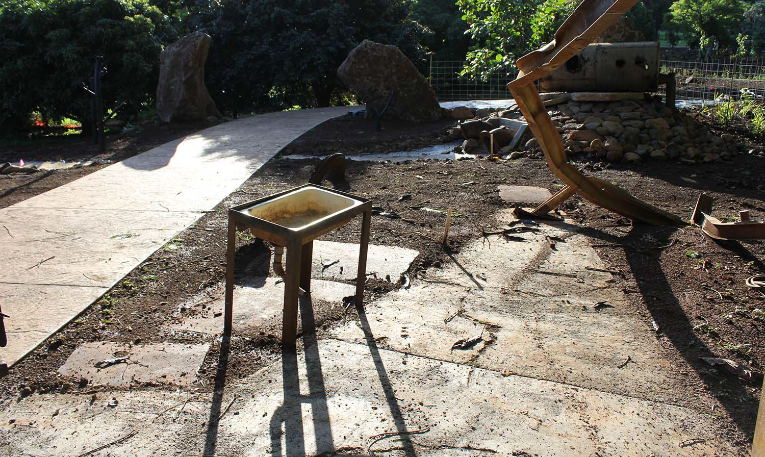 We have asked Wayne to work with found objects (partly to keep the area within budget, but also to represent an industrial era / heritage that is inextricably linked to NTBG as an organization. The image above was used to aid discussion – to help artist and client to debate concepts as well as plan practical delivery within the space, budget, timeframe and other contractors¬. It is hard to communicate how this process works but Wayne, Wing and Andy are completely aligned and are confident we will produce an element of an experience that will be so provocative and memorable (and in keeping with the garden) that it will help the biodiversity trail be the envy of other botanical gardens, will win awards and have the gravitas to place NTBG firmly on the public engagement and delivery of science education map.
