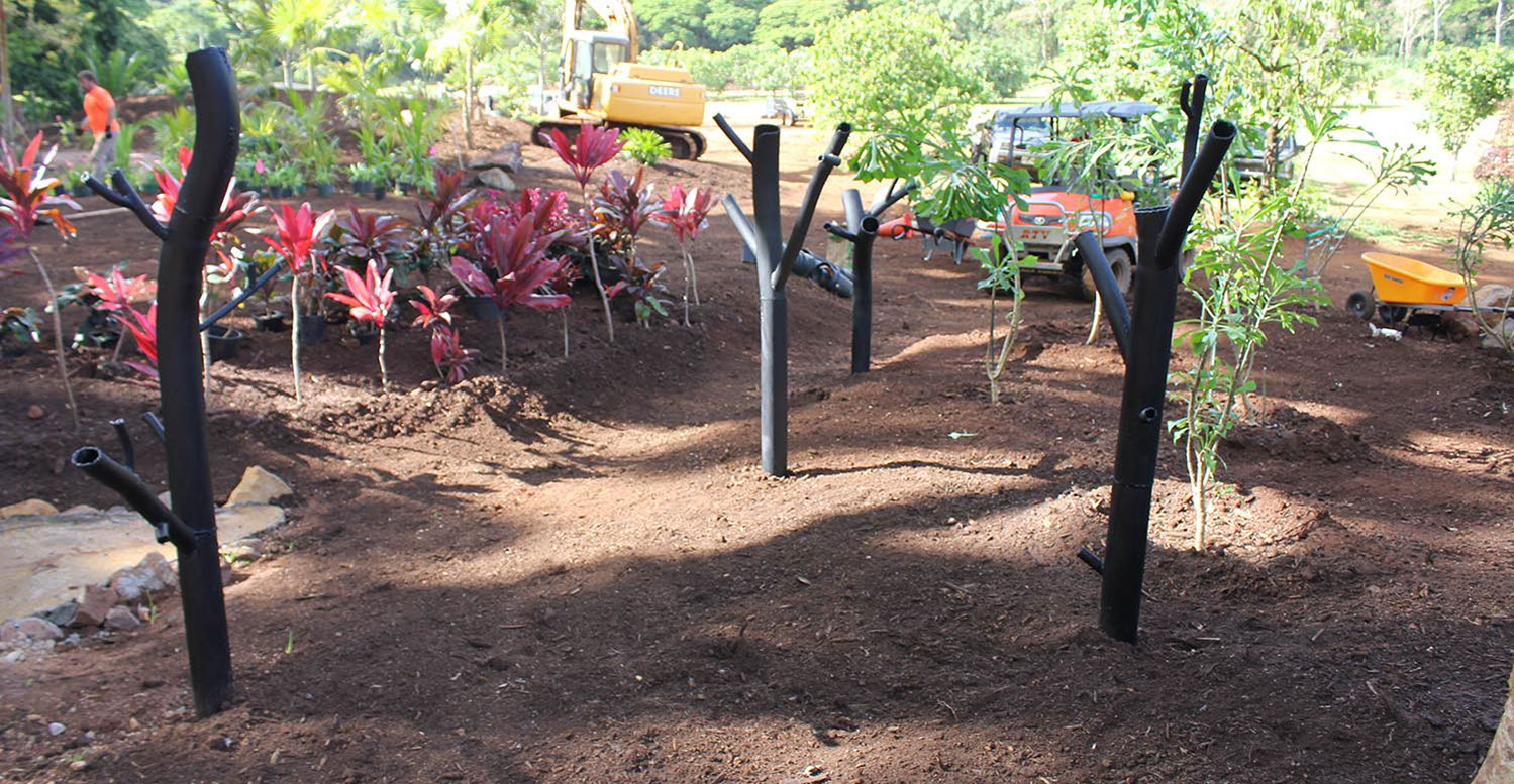 Our concept was to create something that was different to the ‘beautiful garden’, that visitors could walk through our trail (one way will be through one of the most beautiful gardens on Kauai and on the other after walking past stories of how NTBG has been making a difference (saving plants saving people) to discover a dark, perhaps twisted world representing how man’s attempts to concur, tame and harness nature have often have had consequences. We don’t want to over egg these issues because we want visitors to move on swiftly to think about solutions and how they can play a role. But we do need them to ‘get it’ quickly.