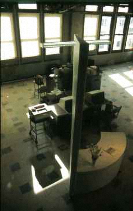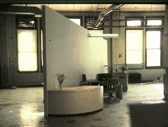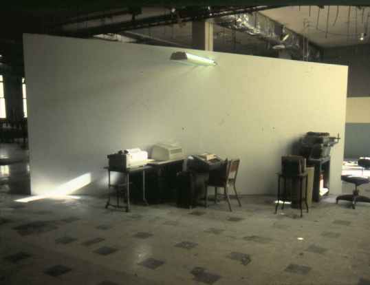 "The Haines gallery held an exhibit in an abandoned Western Union office. Artists were allowed to use existing discarded artifacts from the site. I set up an office environment with a receptionists desk. (A receptionist would sit at it during the exhibit ). A new wall was constructed right through the furniture and equipment, dividing it in two . It had a dreamlike quality , as if the typewriters and desks were melting into the wall.